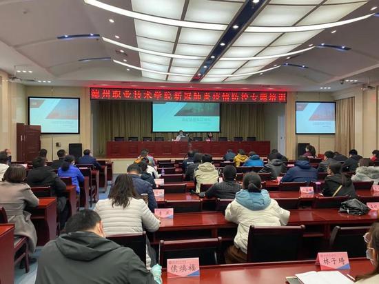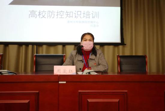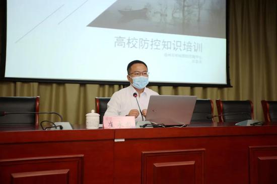 为进一步提高我校新冠肺炎疫情防控的知识和技能水平,做好开学准备工作,保障全校师生员工生命安全和身体健康,4月9日,15vip太阳集团特别邀请德州市疾控中心专家崔永彪来校,针对新冠肺炎疫情防控知识和学校开学前后防控管理工作做专题培训和指导。党委副书记、工会主席张恒斌,学生处、保卫处、后勤处、医务室等相关工作人员,各单位教职工健康联络员,各系部学生科长、辅导员参加了此次培训活动。党委委员、组织人事处处长周爱红主持培训活动。