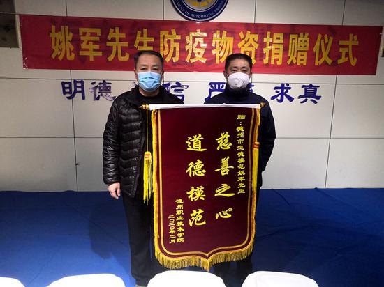 “希望尽自己的绵薄之力为德州职院的师生卫生安全保驾护航,希望自己能带好头,让越来越多社会人士为德州职院防疫工作带来温暖”,在交接仪式上,姚军坚毅的眼光下流露出真情告白。作为德州市慈善界有一定知名度的爱心人士,姚先生回馈奉献社会的报道经常出现在媒体上,在父亲的影响下,他的儿子作为汽车工程系2019级新生的姚劲康也深受鼓舞。父子俩日夜坚守在庆云县抗疫一线,带领抗击疫情志愿者队伍为武汉捐物出力,上演了抗疫一线父子兵的佳话,也被很多媒体争先报道,更是被学习强国推广点赞。