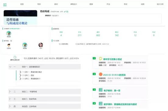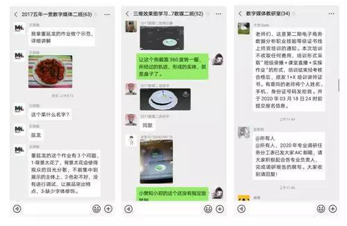 数字媒体教研室的很多课程都属于设计类课程,不仅需要专业的设计理论,而且对实操性有很高的要求。教师在课前依托云平台为学生提供本节课需要掌握的知识点短视频,优秀教学视频案例资源,并创建题库;课中根据学生线上实际听课条件,采用“云平台+微信群+QQ分屏”的模式进行教学,为学生详细讲解课堂知识重难点,随堂开启头脑风暴及互动;课后及时跟踪学生学习进度,布置作业,采用学习效果测验+学生自评的方式,让学生反思不足之处。针对学习疑问,及时在班级群中展开讨论,教师通过多种途径提升学生学习参与度,四个班级、二百多名学生的学习同步进行,达到良好的教学效果。
