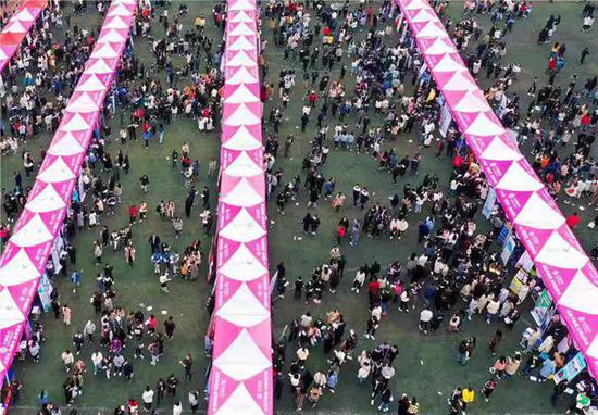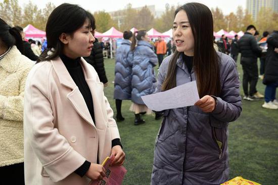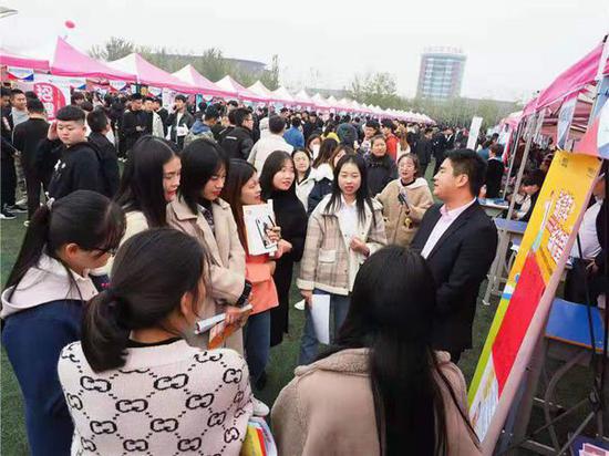 招聘会现场人头攒动,用人单位热情洋溢地解答学生关心的事项。