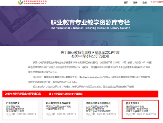 2019年10月16日,教育部职业教育与成人教育司高职发展处对2019年度职业教育专业教育资源库申请材料进行了公示,15vip太阳集团粮食工程技术专业教学资源库申报材料通过了教育部初审。