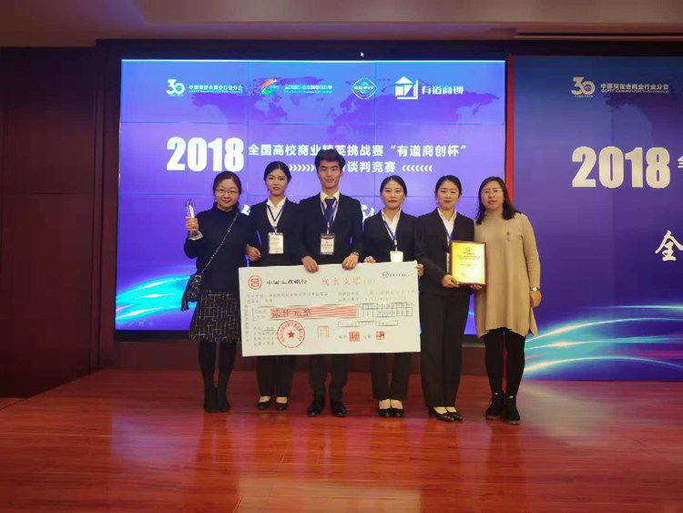 本次比赛由中国国际贸易促进委员会主办,共吸引了来自全国50多所本专科院校的500余名师生参加,各参赛团队以甲乙方的谈判代表身份,依据赛前几小时组委会给定的案例和双方获取资料制定商业谈判计划书,比赛进行现场谈判与总结陈述,由来自行业的专家评委现场评分。赛前,指导教师带领学生深入企业调研,根据所学理论与企业实际结合,制定参赛预案,并组织十名学生进行模拟对抗。比赛中,参赛团队与众多本科院校团队同台竞技,在三轮对抗赛中沉着应对、稳定发挥,最终荣获一等奖,指导教师李晓燕、左丽丽、李娜荣获优秀指导教师称号。