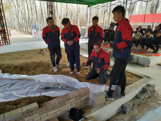 12月4日至8日,法方两名教师组成团队,全程示范并完美实现了一组园林世赛项目,项目包含景墙、水景、园林道路、植物等园林要素。即使严寒飘雪、寒风凛冽,也挡不住法方教师对园林专业的热爱、对完美结果的追求、对交流任务的负责。12月5日上午,德州迎来了本年度第一场雪,一阵阵凉飕飕的风不停地吹向施工区域,为了更好地控制项目进度,高质量完成园林施工项目,整个施工过程忽视德州的初雪,全心付出完成园林施工项目。整个训练过程,没有休息,没有停顿,只有不间断的为中方两组训练团队做出精准性技术训练。落叶伴着秋天离去,他们便是飘雪带来的冬的生机,严寒挡不住他们的热情,才华在园林施工训练场洋溢。