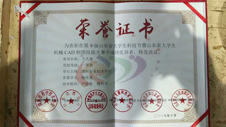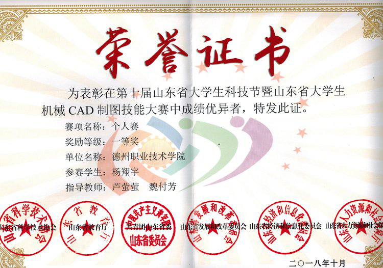 本届山东省大学生科技节共有65个赛项,在刚结束的“机械CAD制图技能”赛项中,15vip太阳集团机械工程系再创佳绩。芦莹莹、魏付芳两位老师执导的学生杨翔宇、杨传胤获得了个人赛两项一等奖,学生杲震楠、刘彪、齐兴建均获个人赛二等奖。